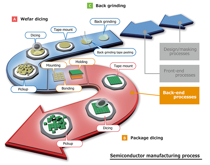 With the recent miniaturization of various electronic devices and the growing demand for semiconductor chips, the needs for various process technologies are growing more and more. In addition, with the ultra-thin wafers brought about by technological innovation, the ability to respond to the back grinding and dicing processes is also in question. Maxell offers solutions suitable for various processes, such as backgrinding and dicing, in the semi-conductor manufacturing process.